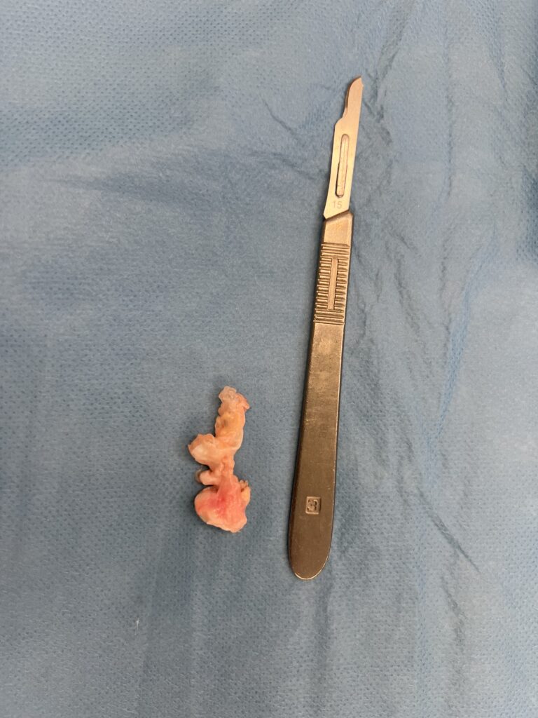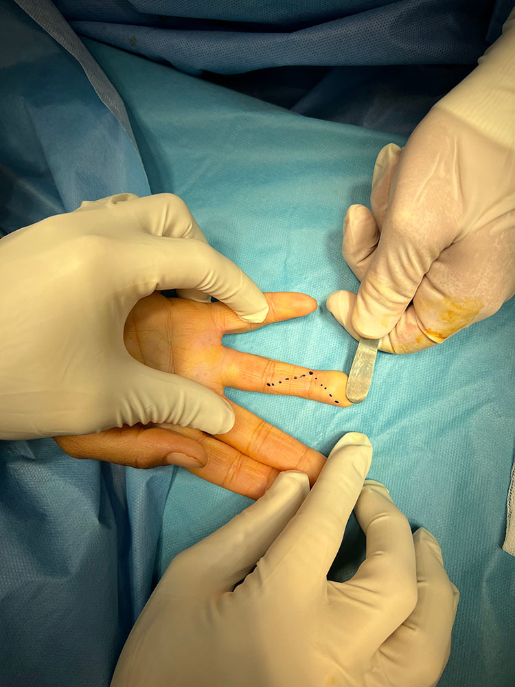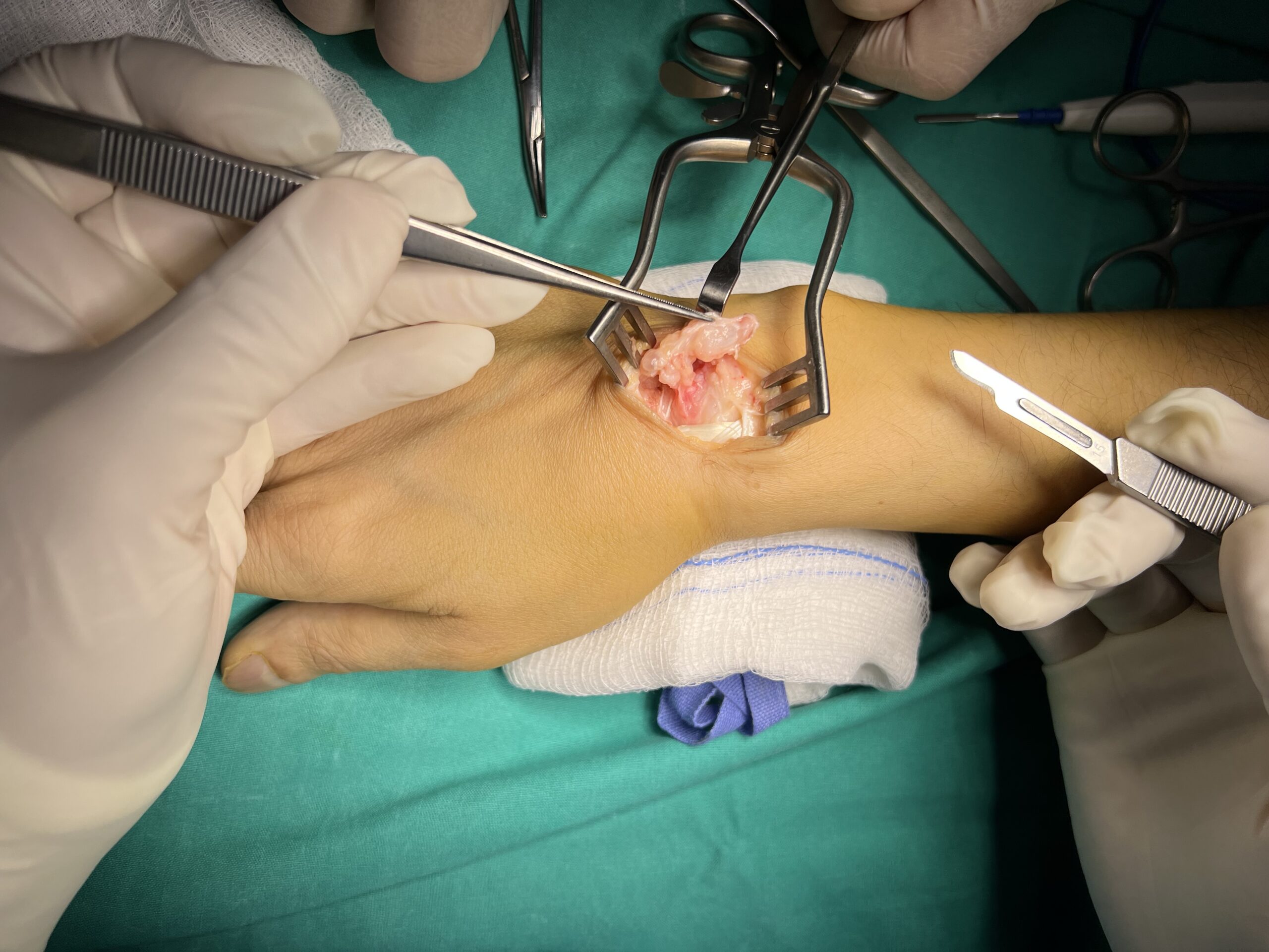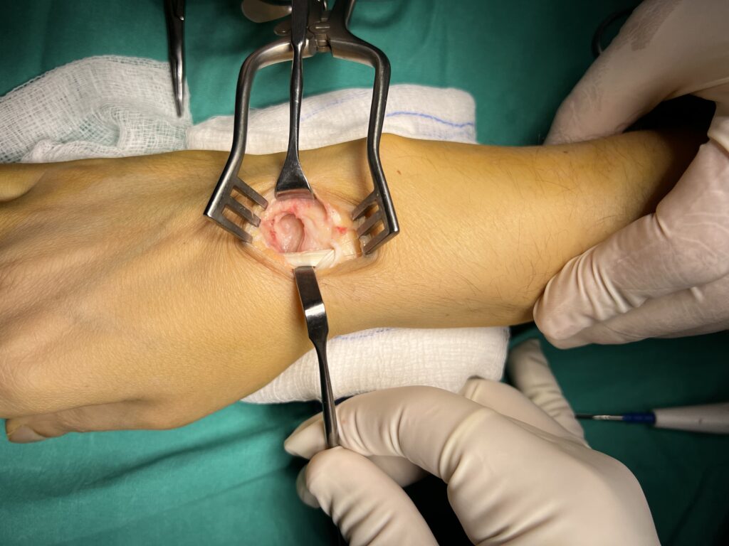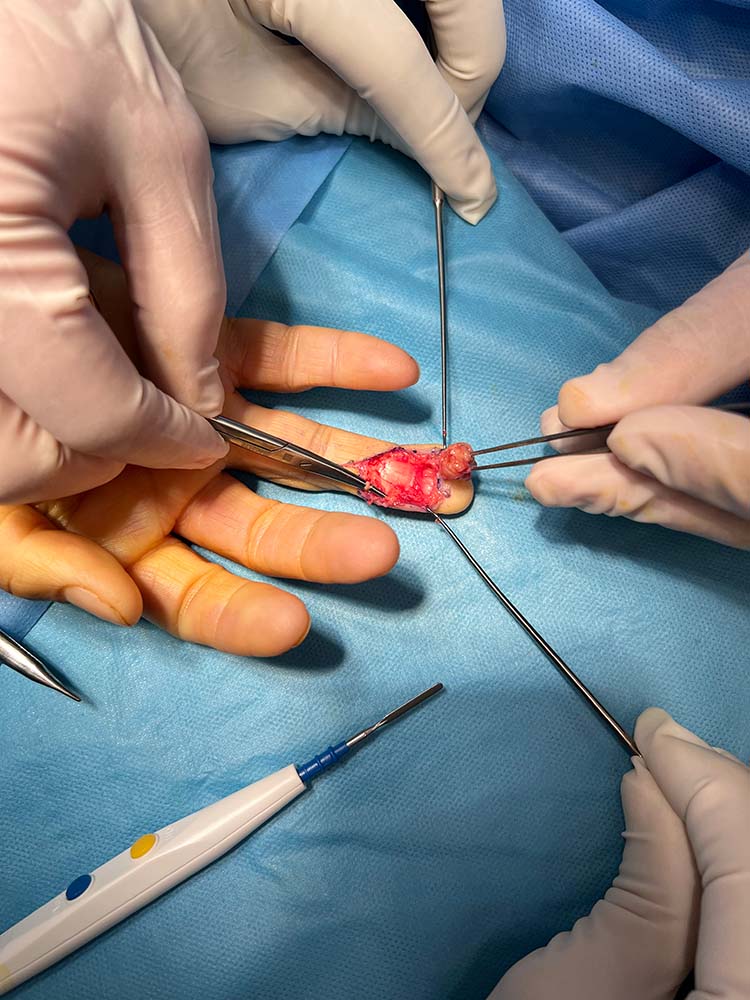 Ειδικότερα, η επέμβαση πραγματοποιείται με τοπική ή περιοχική αναισθησία, ανάλογα με το μέγεθος του γαγγλίου. Η εκρίζωσή του πραγματοποιείται μέσα σε 30 λεπτά και ο ασθενής επιστρέφει άμεσα σπίτι του και στις καθημερινές του δραστηριότητες.